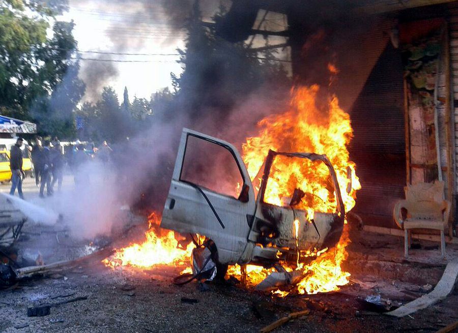 A burning vehicle is seen at the site where a car bomb exploded in Latakia, Syria, on Jan. 22, 2019. (Xinhua)