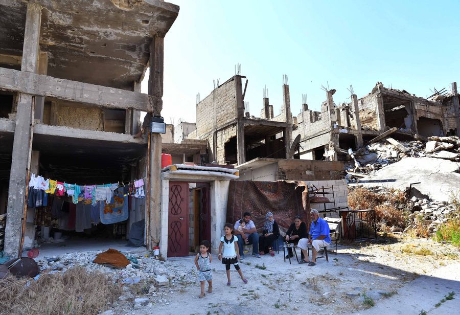 The Shtaiwi family sits outside their house amid the rubbles in the Wadi al-Sayeh street in the central city of Homs, Syria, May 29, 2019. (Xinhua/Ammar Safarjalani)