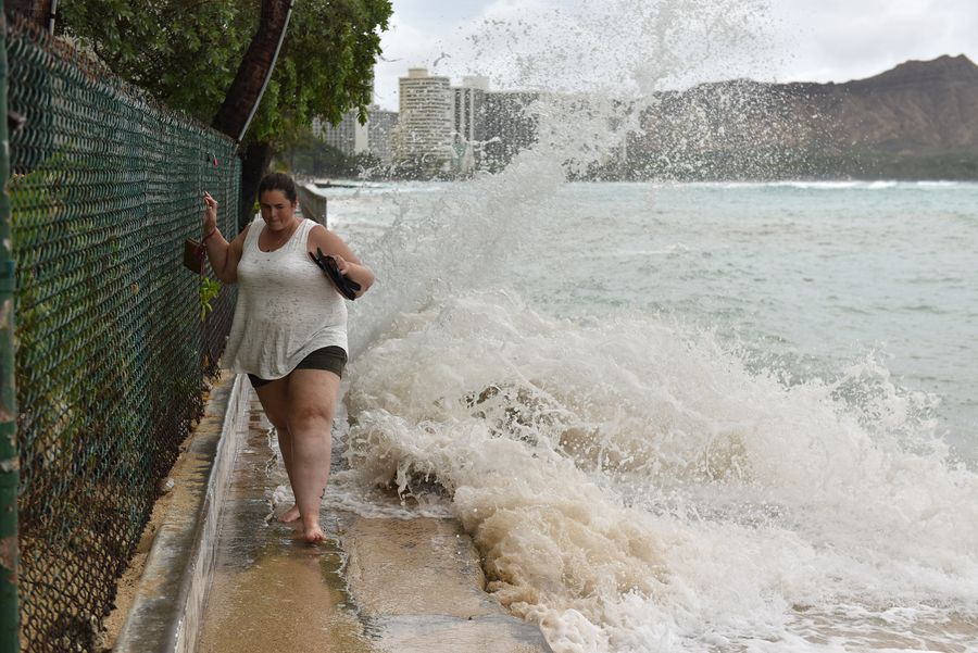 A woman tries to walk on a seashore road while strong tides lapping the seawall at Waikiki beach in Honolulu of Hawaii, the United States, Aug. 23, 2018. (Xinhua/Sun Ruibo)