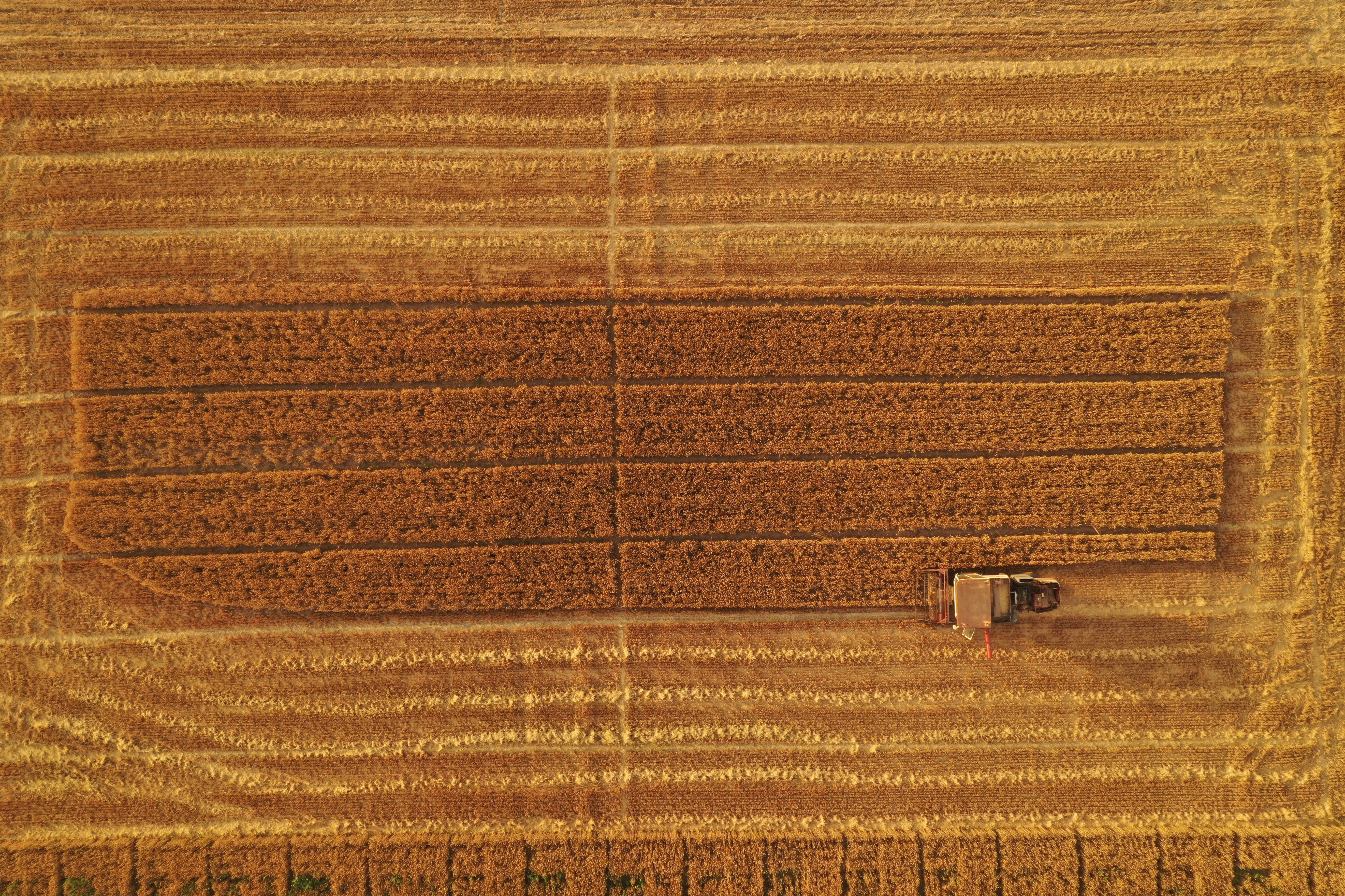 Aerial photo taken on Sept. 20, 2019 shows harvesters cropping alfalfa in Ar Horqin Banner of north China's Inner Mongolia Autonomous Region. (Xinhua/Liu Lei)