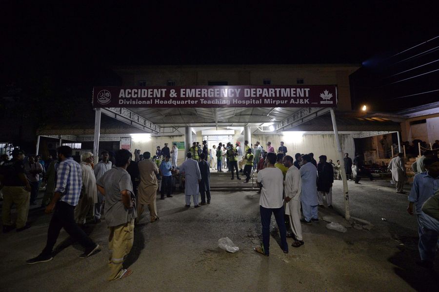 People stand outside a hospital in Mirpur district of Pakistan-controlled Kashmir on Sept. 24, 2019. (Xinhua/Ahmad Kamal)