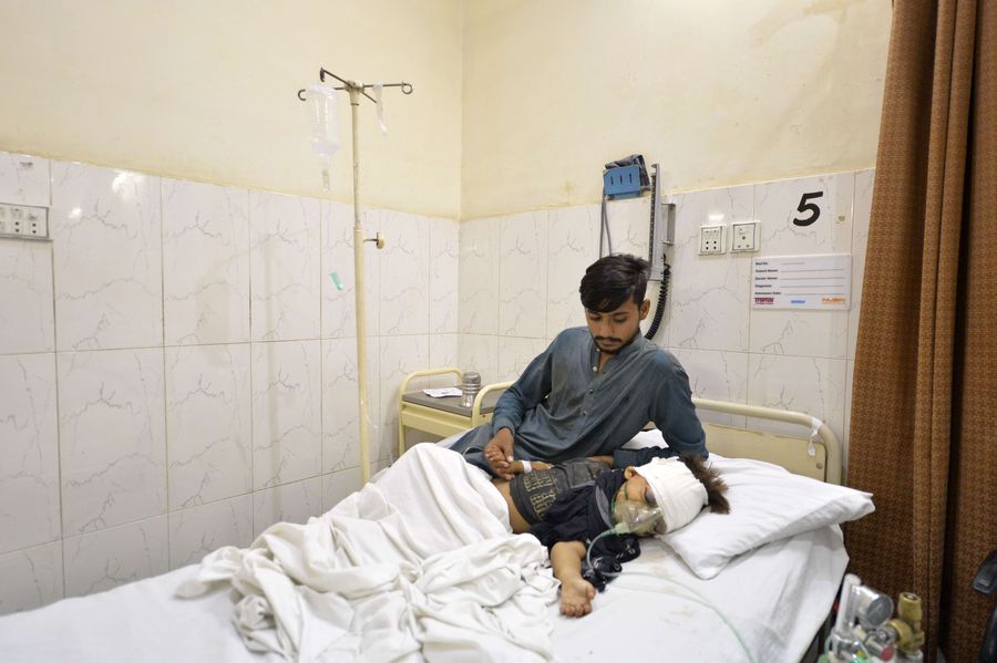 A man takes care of an earthquake victim at a hospital in Mirpur district of Pakistan-controlled Kashmir on Sept. 24, 2019. (Xinhua/Ahmad Kamal)