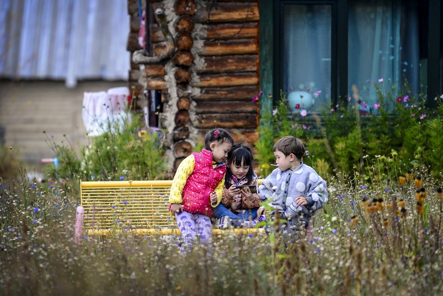 Children play at Kanas scenic spot in northwest China's Xinjiang Uygur Autonomous Region, Sept. 26, 2019. (Xinhua/Wang Fei)