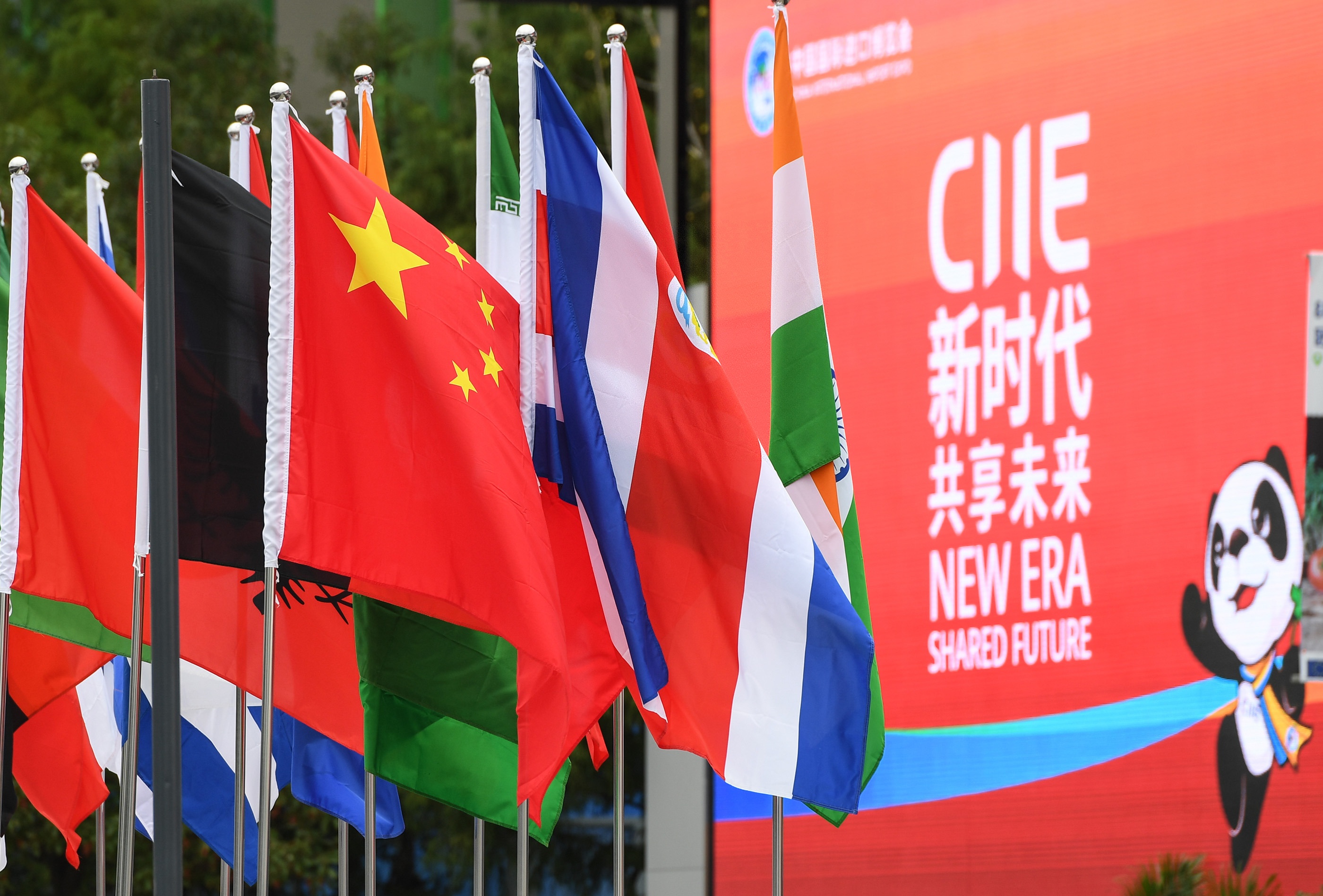Photo taken on Nov. 5, 2018 shows flags at the venue of the first China International Import Expo (CIIE) in Shanghai, east China. (Xinhua/Li He)