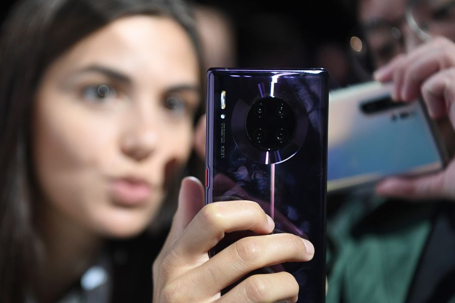 A Huawei's staff member (L) introduces a Mate 30 Pro smartphone to guests after a press conference hosted by Huawei in Munich, Germany, Sept. 19, 2019. (Xinhua/Lu Yang)