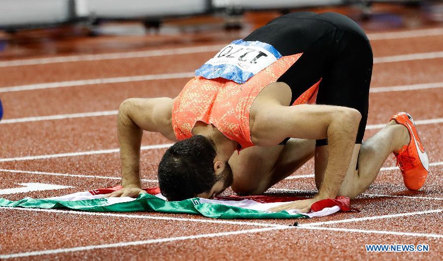 Hassan Taftian of Iran celebrate after winning the men's 100m final of track and field at the 7th CISM Military World Games in Wuhan, capital of central China's Hubei Province, Oct. 22, 2019. (Xinhua/Wang Lili)