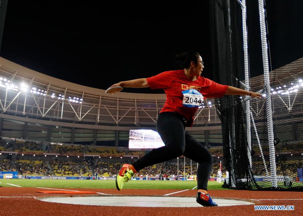 Feng Bin of China competes during the women's discus throw final of track and field at the 7th CISM Military World Games in Wuhan, capital of central China's Hubei Province, Oct. 24, 2019. (Xinhua/Wang Lili)