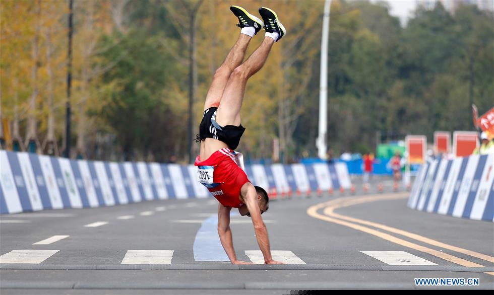 Renato Dorzi of Albania turns a somersault at the finishing line after the men's marathon individual final of track and field at the 7th CISM Military World Games in Wuhan, capital of central China's Hubei Province, Oct. 27, 2019. (Xinhua/Wang Lili)