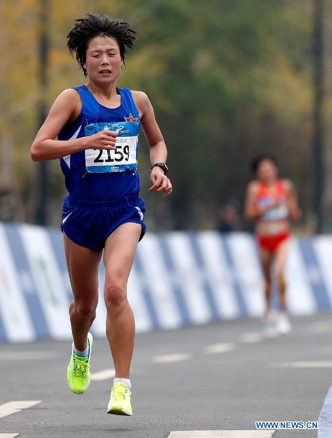 Pak Il Sim of the Democratic People's Republic of Korea (DPRK) competes during the women's marathon individual final of track and field at the 7th CISM Military World Games in Wuhan, capital of central China's Hubei Province, Oct. 27, 2019. (Xinhua/Wang Lili)