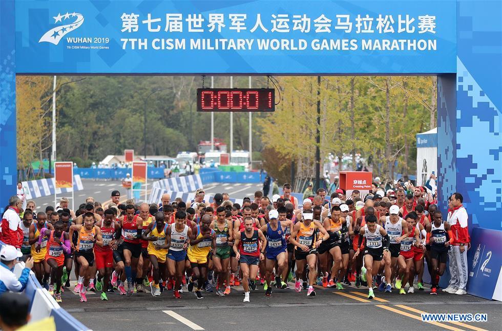 Athletes set off during the marathon of track and field at the 7th CISM Military World Games in Wuhan, capital of central China's Hubei Province, Oct. 27, 2019. (Xinhua/Wang Lili)