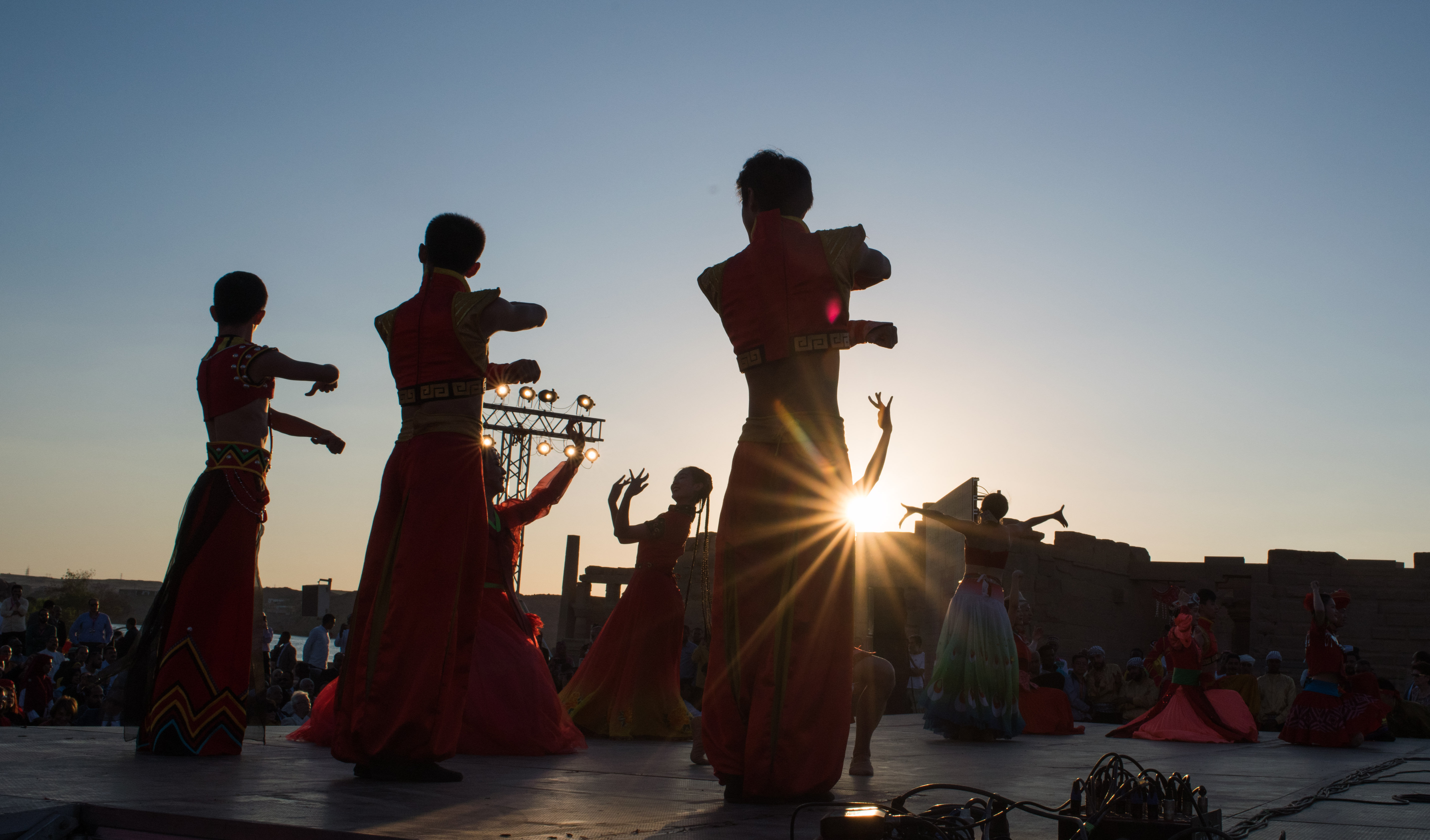 Artists from China's Xiamen Little Egret Folk Dance Group perform at Philae Temple in Aswan, Egypt, on Oct. 27, 2019. The fourth Afro-Chinese Arts and Folklore Festival kicked off on Sunday inside ancient Philae Temple in Upper Egypt's Province of Aswan. (Xinhua/Wu Huiwo)