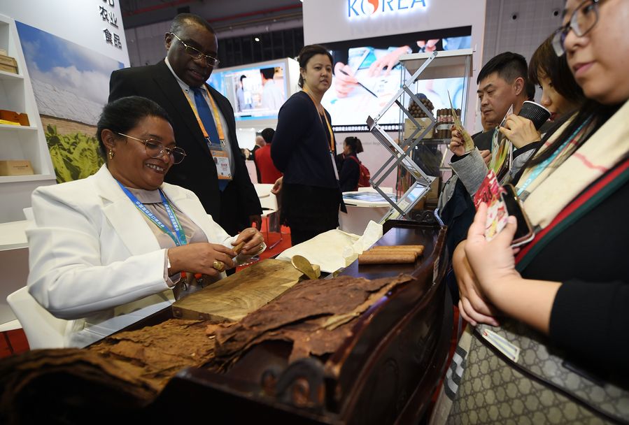 An exhibitor makes cigars at the booth of Cuba at the first China International Import Expo (CIIE) in Shanghai, east China, Nov. 6, 2018. (Xinhua/Han Yuqing)