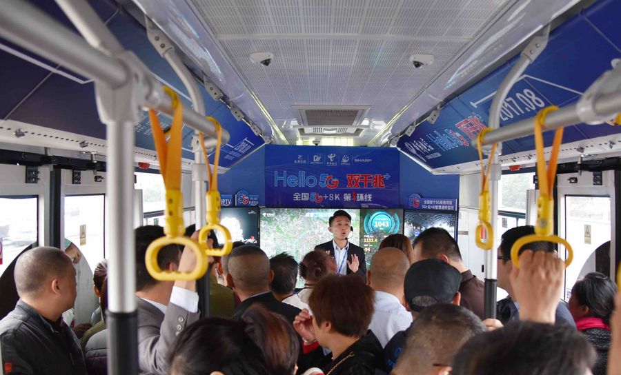 A staff member of China Telecom introduces the 5G-covered bus to passengers in Chengdu, capital of southwest China's Sichuan Province, Oct. 31, 2019. (Xinhua)