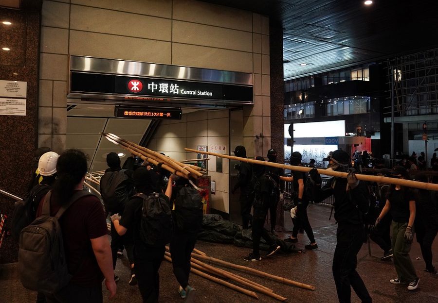 Besides setting fire on barricades, shops and Mass Transit Railway (MTR) stations at various locations, masked rioters, who used umbrellas as cover, also hurled bricks at police officers and police vehicles in Hong Kong Island.