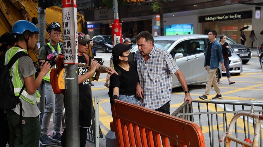 This photo shows a bystander wrangling with rioters while trying to dismantle the road blocks set up by violent protesters. (Xinhua)