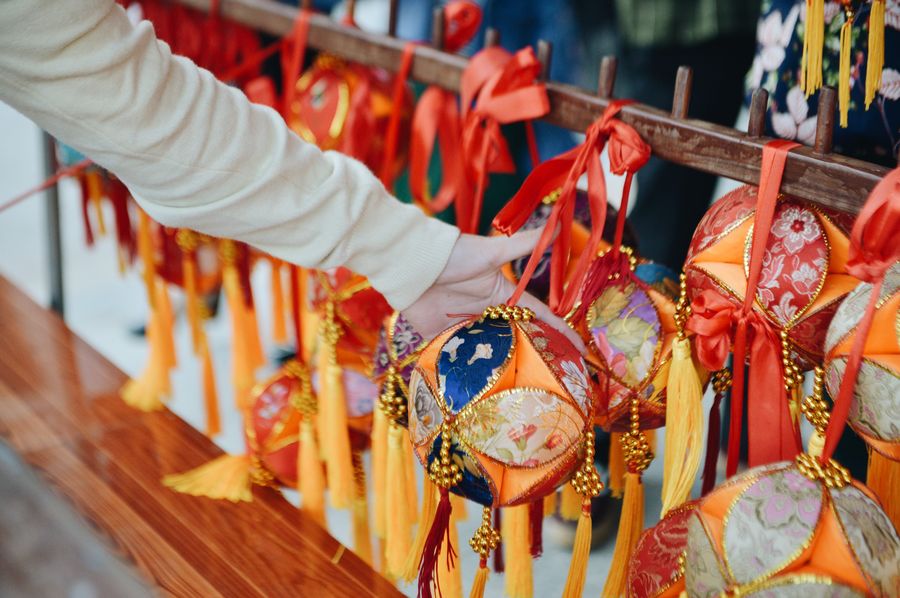 A tourist takes a picture of embroidered balls in Jiuzhou ancient town of Jingxi City, Nov. 4, 2019. (Xinhua/Cui Bowen)