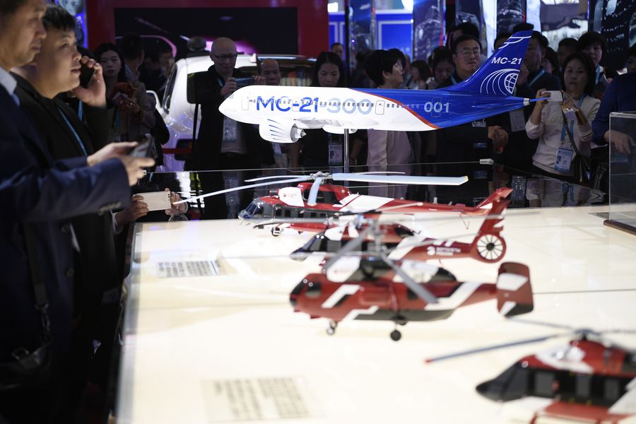 Visitors watch plane models at Russia pavilion during the second China International Import Expo (CIIE) in Shanghai, east China, Nov. 6, 2019. (Xinhua/Wang Peng)