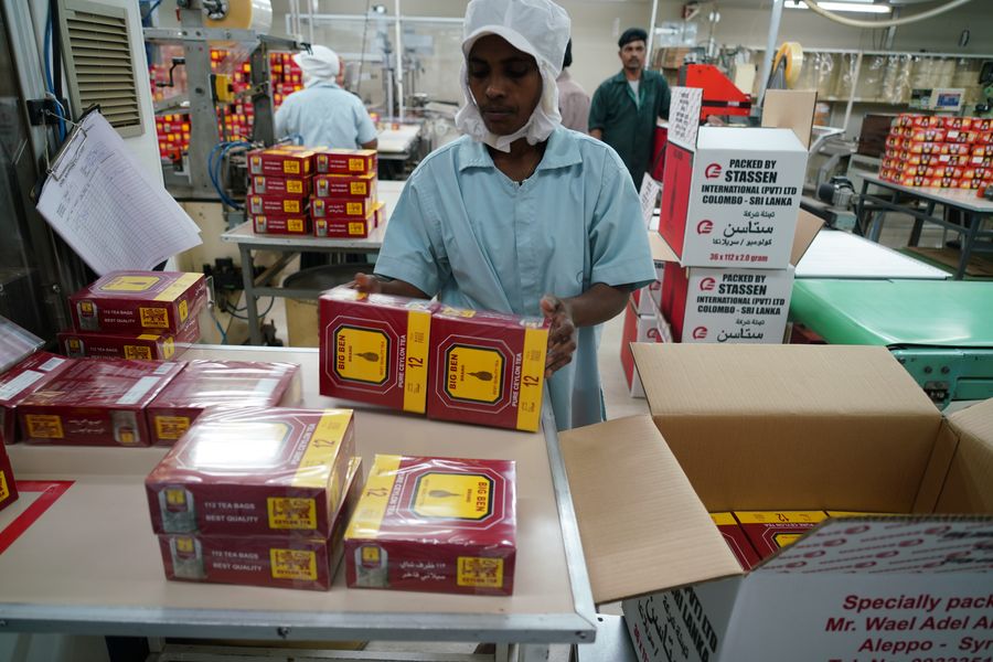 Staff members work on the production line of organic teas at Stassen Exports Private Limited in Colombo, Sri Lanka, Oct. 28, 2019. (Xinhua/Tang Lu)