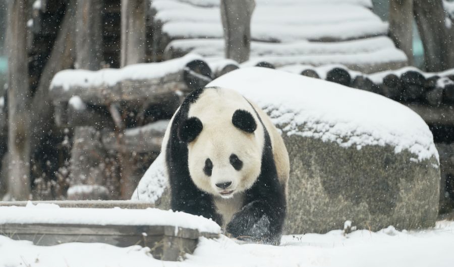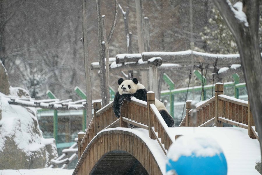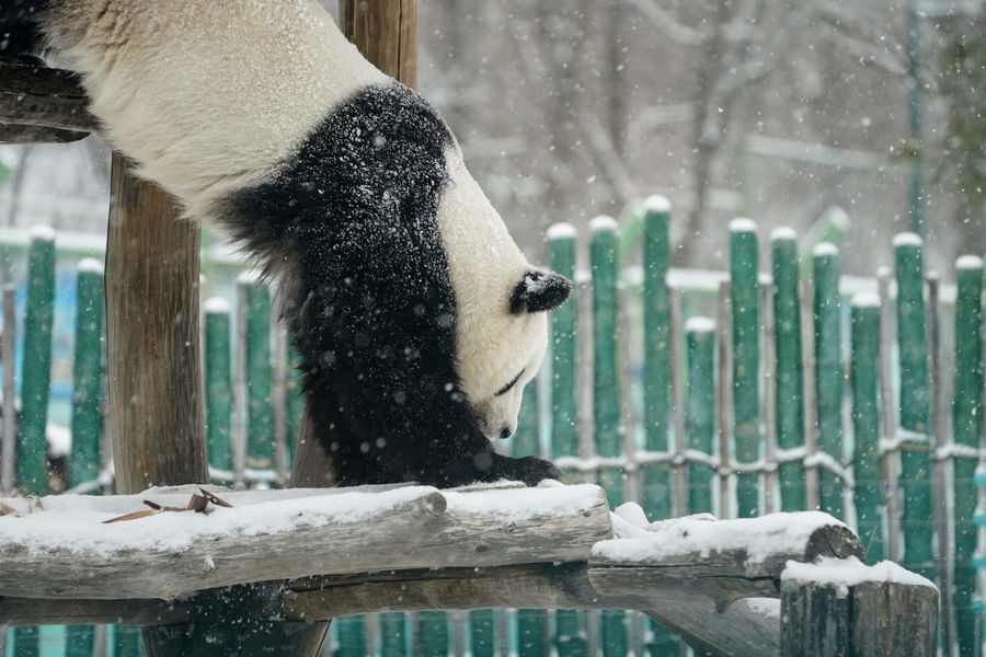 Amazed by the snowfall, Giant panda Sijia found herself a naughty baby cub again at the age of 13 years old.