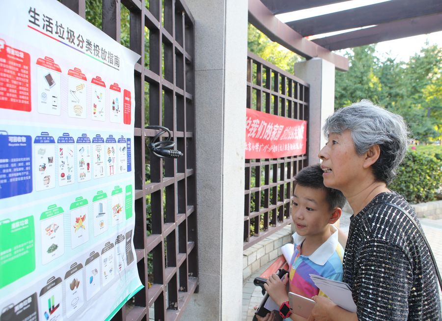 A pupil from Beijing Primary School Guangwai branch explains garbage sorting to a resident of Maliandao community in Beijing, capital of China, Aug. 29, 2019. (Xinhua/Ding Hongfa)