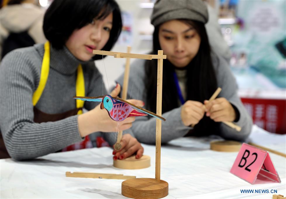 People play splicing wooden toys at Shanghai International Hobby&Craft Expo in east China's Shanghai, Nov. 29, 2019. The three-day Shanghai International Hobby&Craft Expo kicked off here on Friday. (Xinhua/Liu Ying)