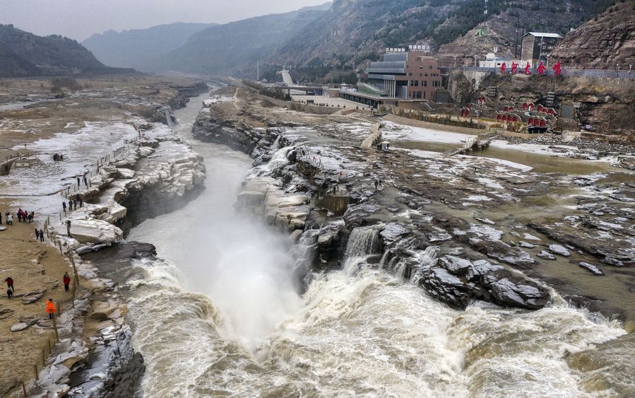 Tourists visit the Hukou Waterfall scenic spot, Dec. 14, 2019. (Xinhua/Tao Ming)