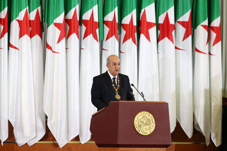 Algeria's President Abdelmadjid Tebboune delivers a speech during his inauguration ceremony at the Congress Palace in west Algiers, Algeria, Dec. 19, 2019. (Xinhua)