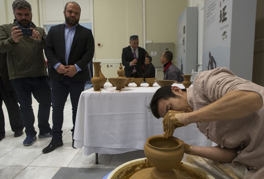 Entitled "Porcelain Journey along Silk Road - On Site Performance of the Traditional Porcelain Shaping Technique", the exhibition at Zappeion exhibition hall is hosted by the State Council Information Office of China. It includes antiques dating back to four centuries ago, as well as contemporary works by Chinese artisans.