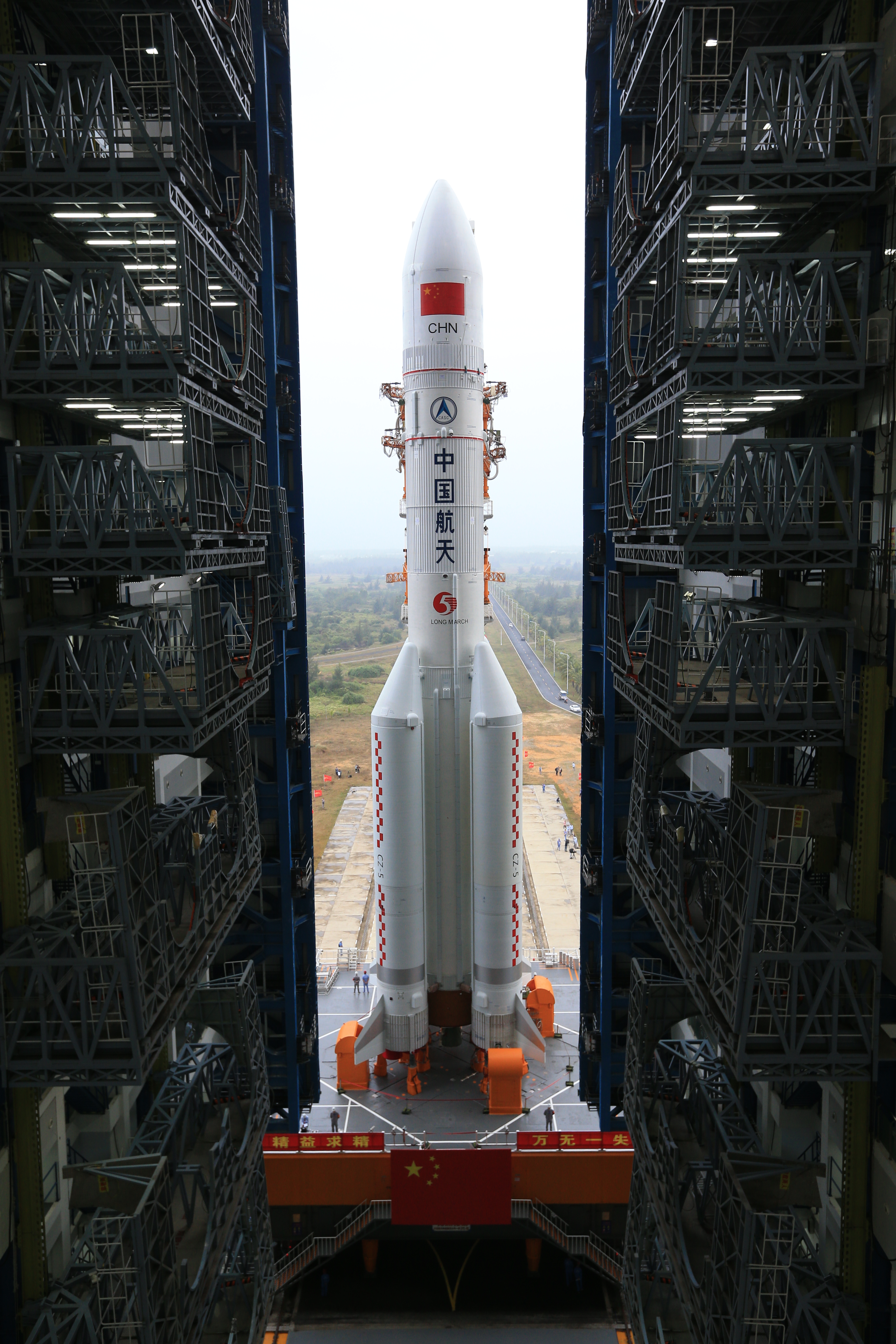 Carrier rocket Long March-5 Y3 is being vertically transported to the launching area of Wenchang Space Launch Center in south China's Hainan Province, Dec. 21, 2019. (Photo by Tu Haichao/Xinhua)