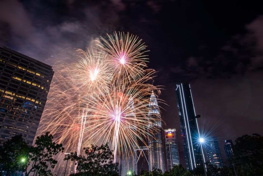 Photo taken on Dec. 31, 2019, shows people celebrate the New Year near the Petronas Twin Towers in Kuala Lumpur, Malaysia. (Xinhua/Chong Voon Chung) ■