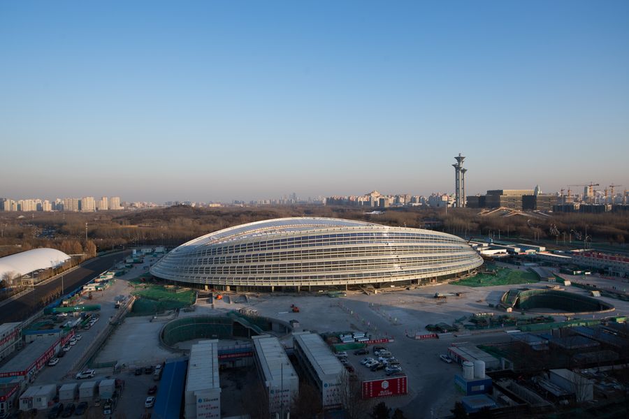 The National Speed Skating Oval, also known as the "Ice Ribbon", in Beijing, Dec. 31, 2019. Construction of the venue is progressing as scheduled. It is expected to host test events in June 2020 for the Beijing 2022 Winter Olympics, (Xinhua/Ju Huanzong)