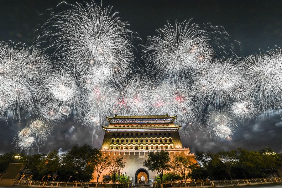 Fireworks explode during a grand evening gala marking the 70th founding anniversary of the People's Republic of China (PRC) in Beijing, Oct. 1, 2019. (Xinhua/Ren Chao)