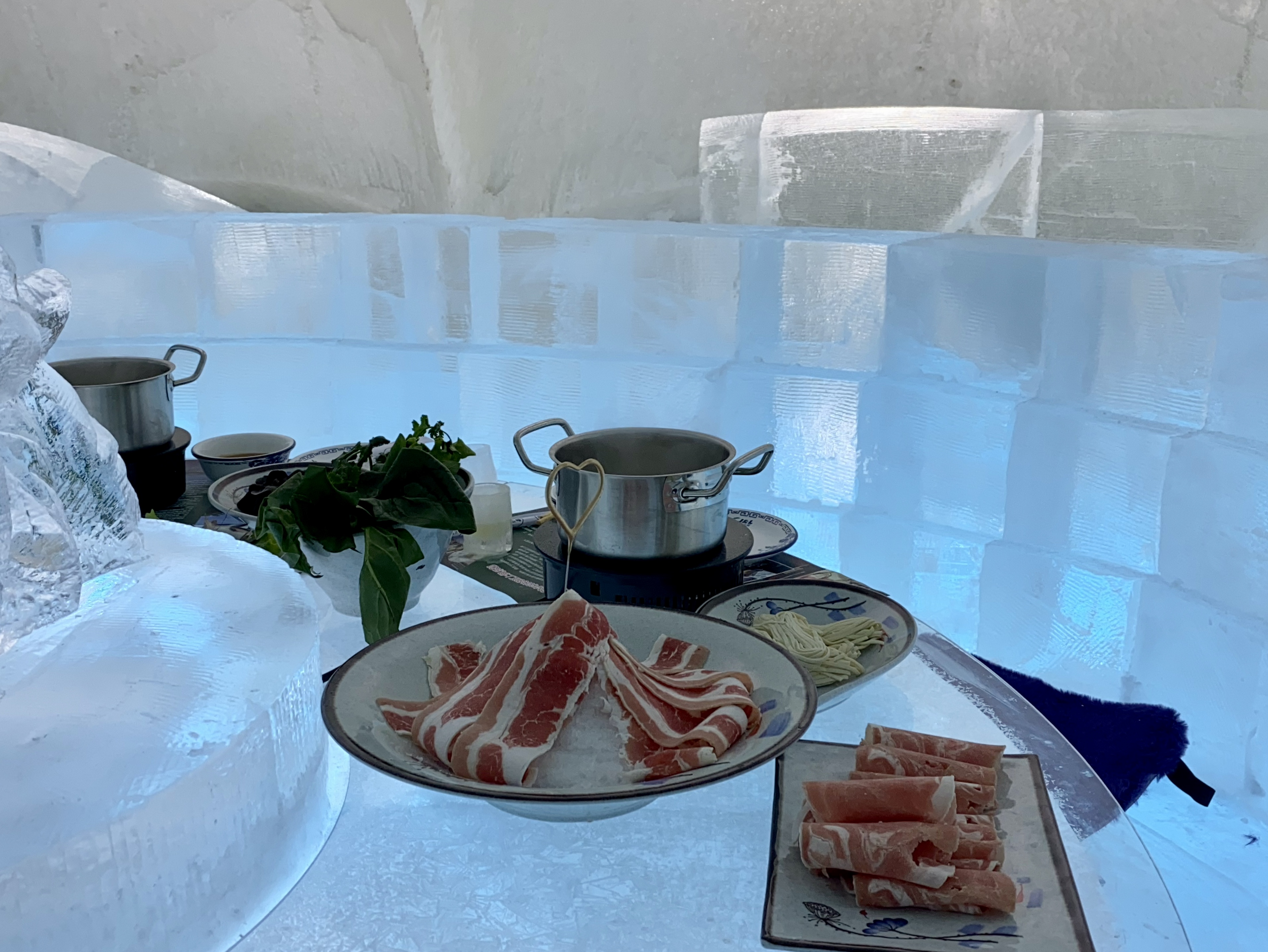 Photo taken on Jan. 12, 2020 shows a table is set for a hotpot meal inside the Ice Shell in Harbin Ice and Snow World, northeast China's Heilongjiang Province. (Xinhua/Yang Siqi)
