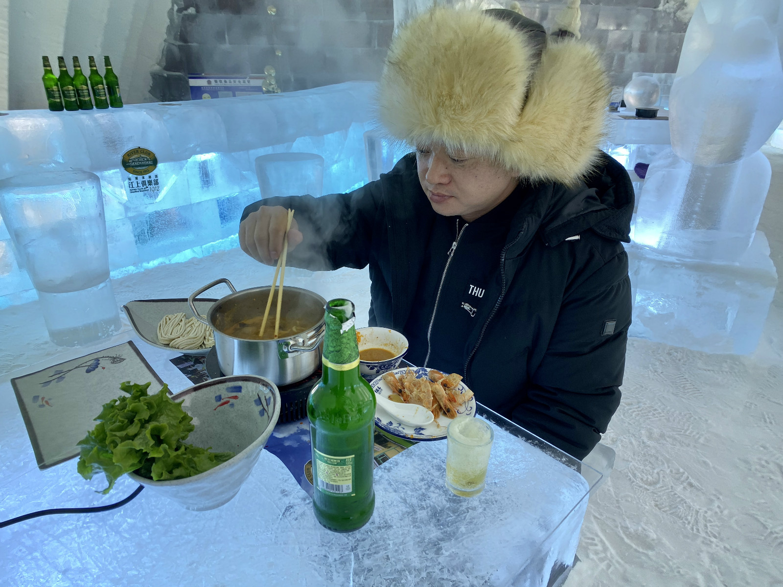 Photo taken on on Jan. 12, 2020 shows a tourist enjoys hotpot inside the Ice Shell in Harbin Ice and Snow World, northeast China's Heilongjiang Province. (Xinhua/Yang Siqi)