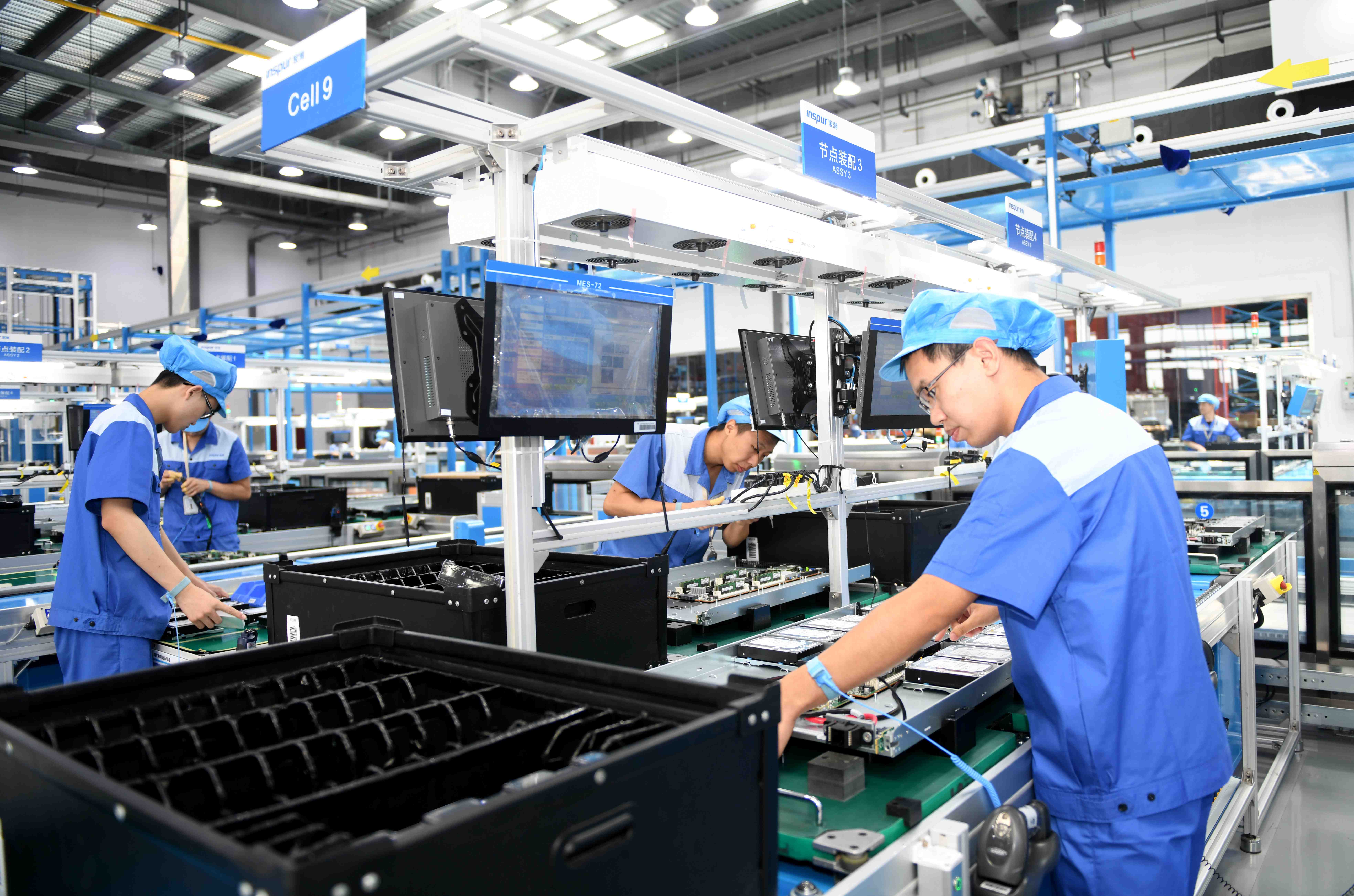 Staff members work at a production base of server manufacturer Inspur in Jinan, east China's Shandong Province, June 14, 2018. (Xinhua/Zhu Zheng)