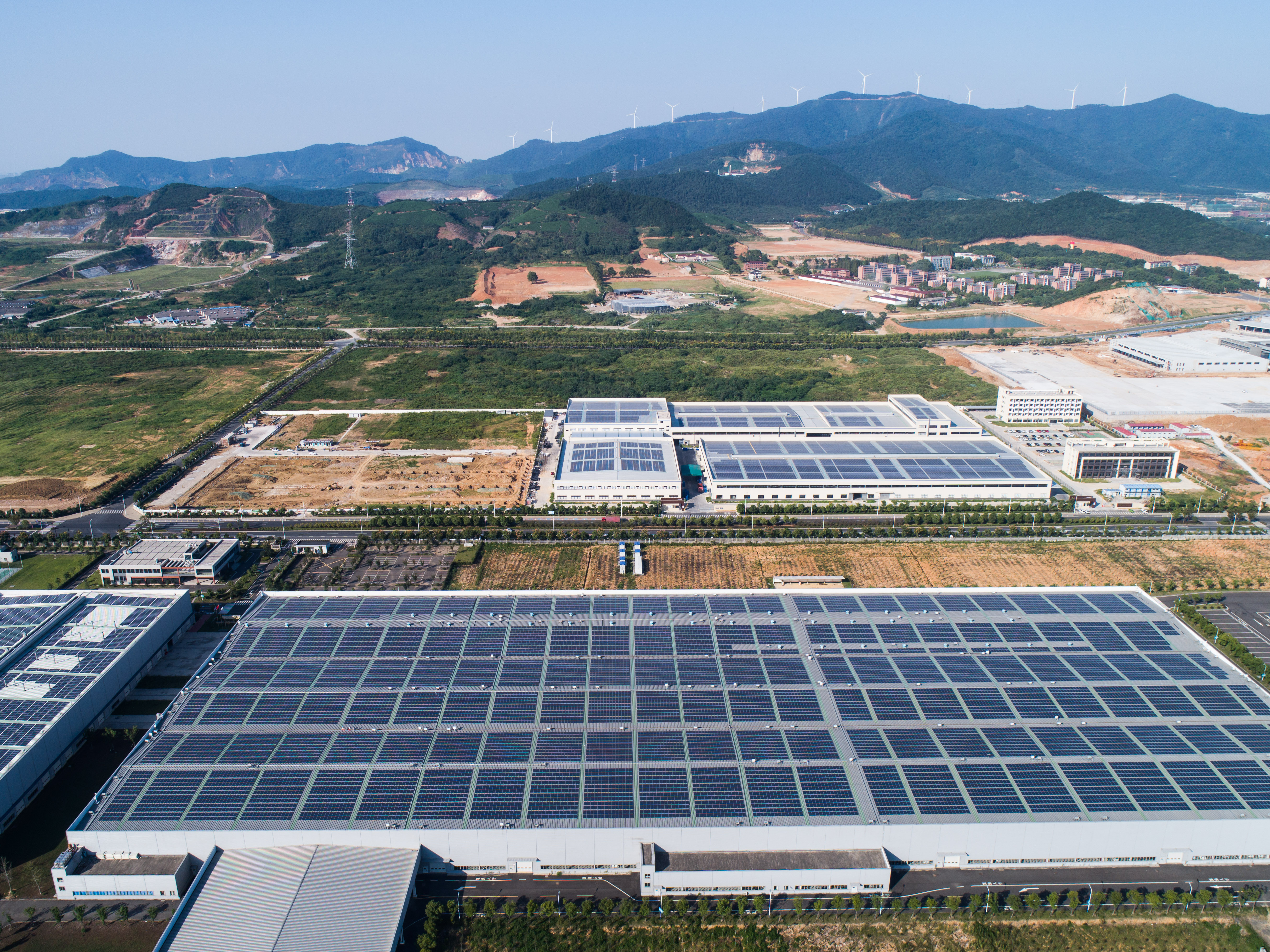 Aerial photo taken on Sept. 19, 2019 shows solar panels on the rooftop of a local automobile maker in Huzhou, east China's Zhejiang Province. (Xinhua/Xu Yu)