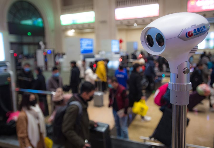 A thermal detector at Hankou Railway Station in Wuhan, capital of central China's Hubei Province, Jan. 22, 2020. (Xinhua/Xiao Yijiu)
