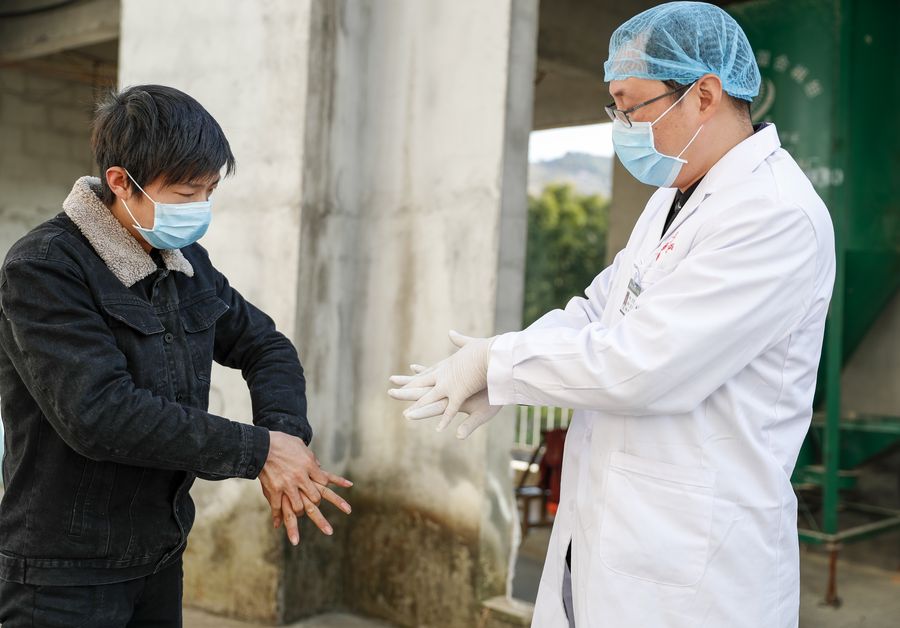 Zheng Hui (R), a senior doctor of a local health center, shows a villager how to wash hands correctly at Huatai Township in Wuxi County, southwest China's Chongqing, Jan. 28, 2020. (Xinhua/Huang Wei)