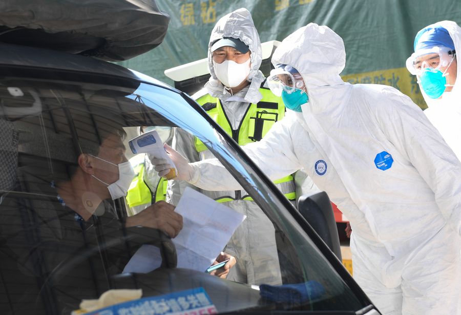Mauritian Hosany Sumayyah measures body temperature for a driver at a novel coronavirus prevention-and-control checkpoint of an expressway exit in Wenzhou, east China's Zhejiang Province, Feb. 8, 2020.(Xinhua/Weng Xinyang)
