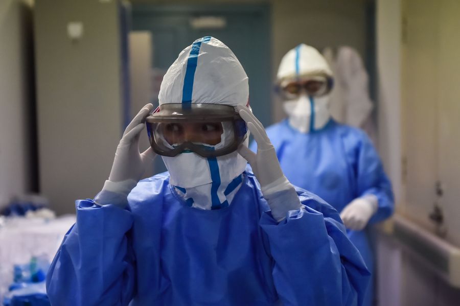 Nurses put on protective goggles outside a ward in Beijing Ditan Hospital in Beijing, capital of China, Feb. 3, 2020. (Photo by Peng Ziyang/Xinhua)