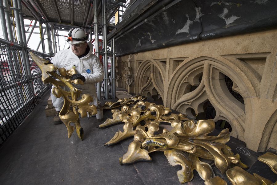 Photo taken on March 14, 2018 shows decorative roof parts being inspected in London, Britain.(Mark Duffy/UK Parliament handout via Xinhua) HOC MANDATORY CREDIT: UK Parliament/Mark Duffy