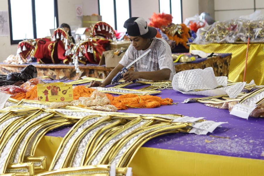A worker makes costumes at a workshop of Unidos de Vila Maria samba school in Sao Paulo, Brazil, Feb. 14, 2020. (Photo by Rahel Patrasso/Xinhua)