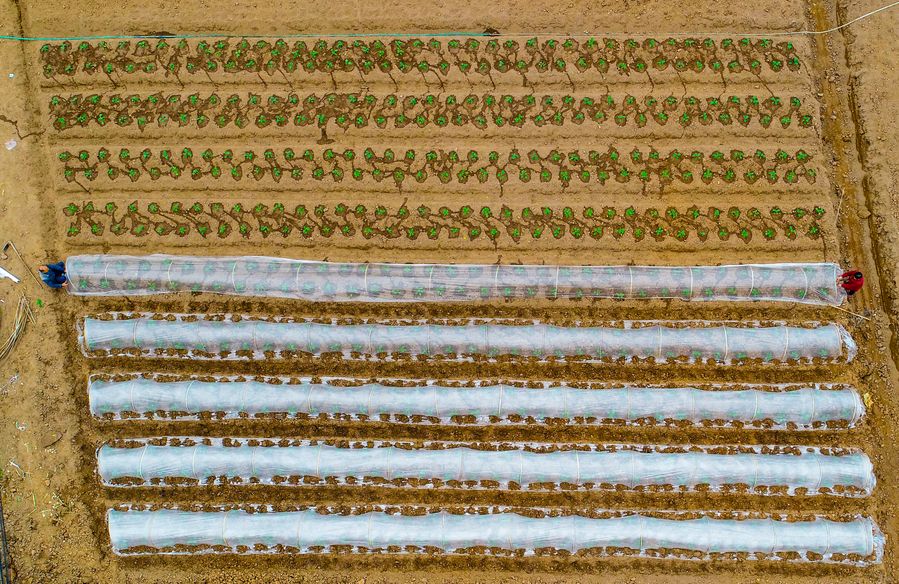 Aerial photo taken on Feb. 27, 2020 shows farmers working at Nanxi District of Yibin City, southwest China's Sichuan Province. (Photo by Zhuang Geer/Xinhua)