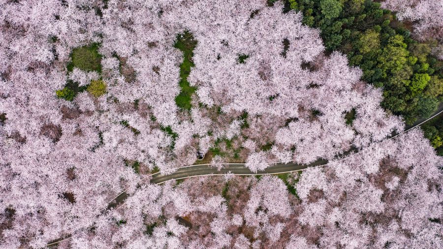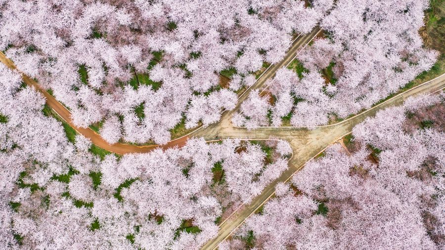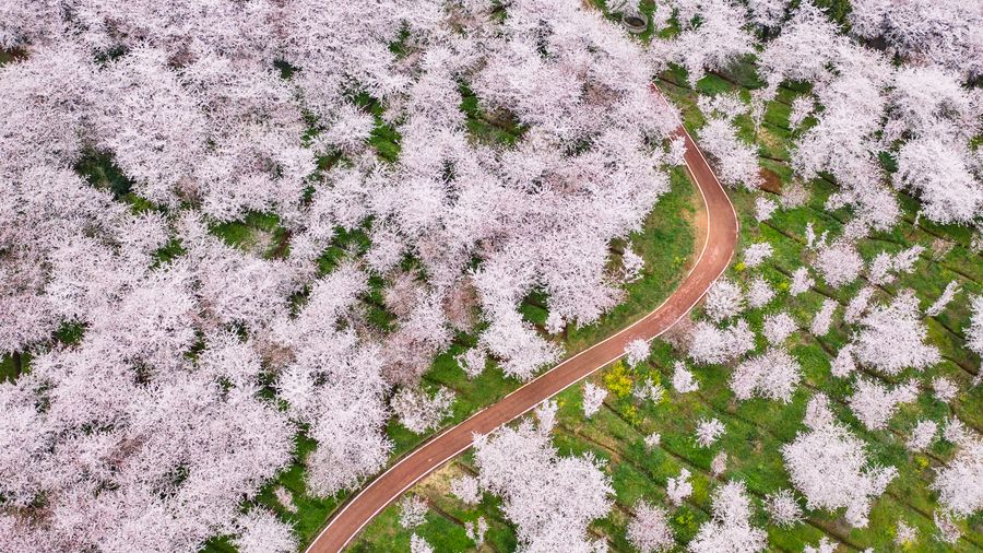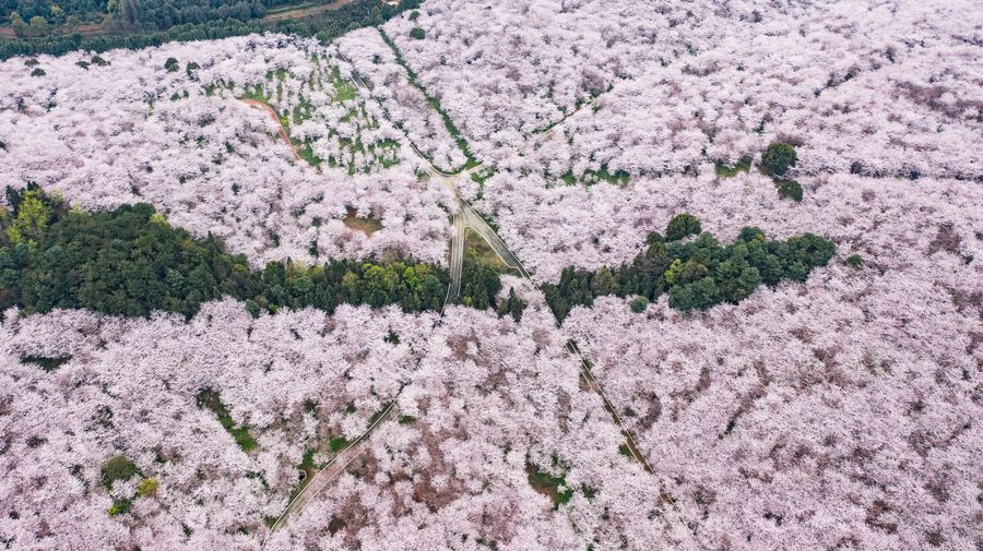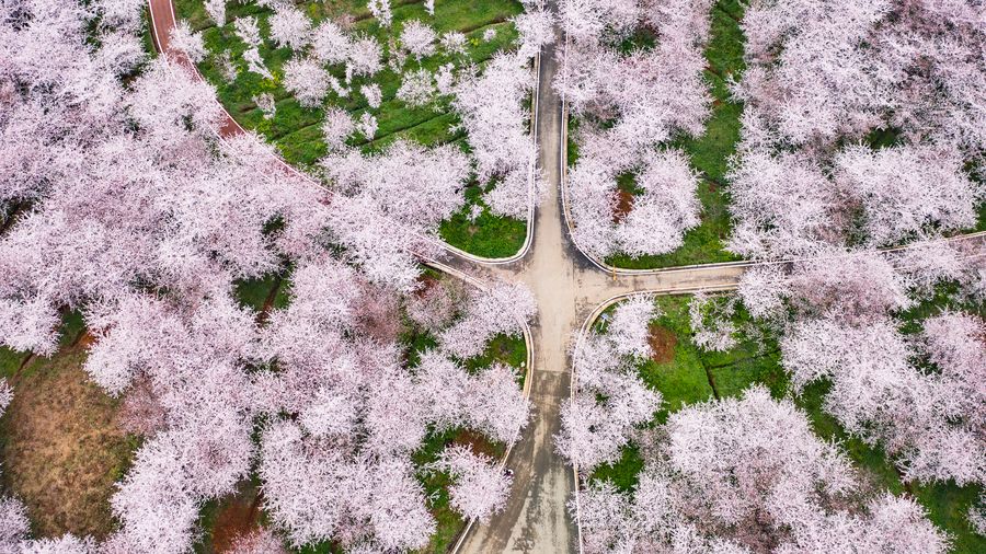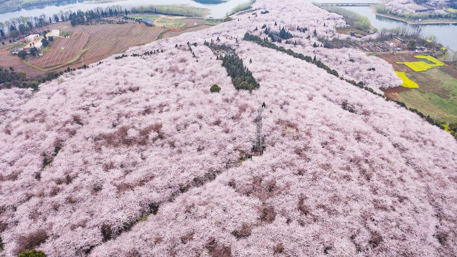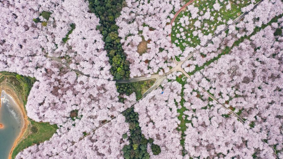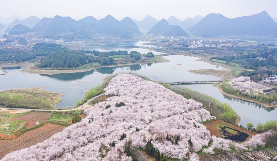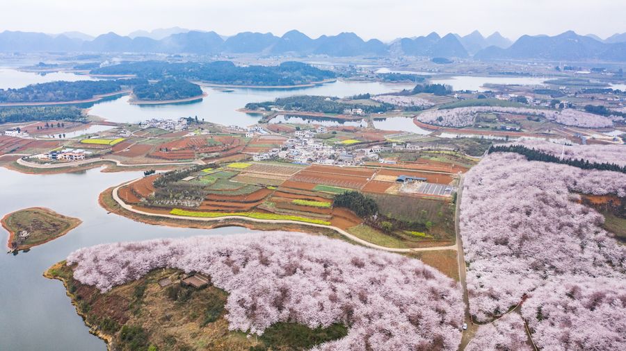 Aerial photo taken on March 12, 2020 shows the scenery of cherry blossoms in Guian New District, southwest China's Guizhou Province. (Xinhua/Tao Liang)