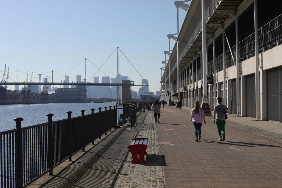 People walk outside the ExCel exhibition centre in London, Britain, March 25, 2020. (Photo by Tim Ireland/Xinhua)