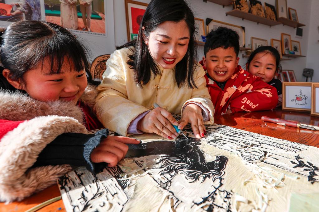 Xue Yin (2nd L), an inheritor of Huizhou woodblock printing, makes a print themed on the Year of the Horse at a studio in Tunxi District of Huangshan City, east China's Anhui Province, Feb. 11, 2026. (Photo by Shi Yalei/Xinhua)