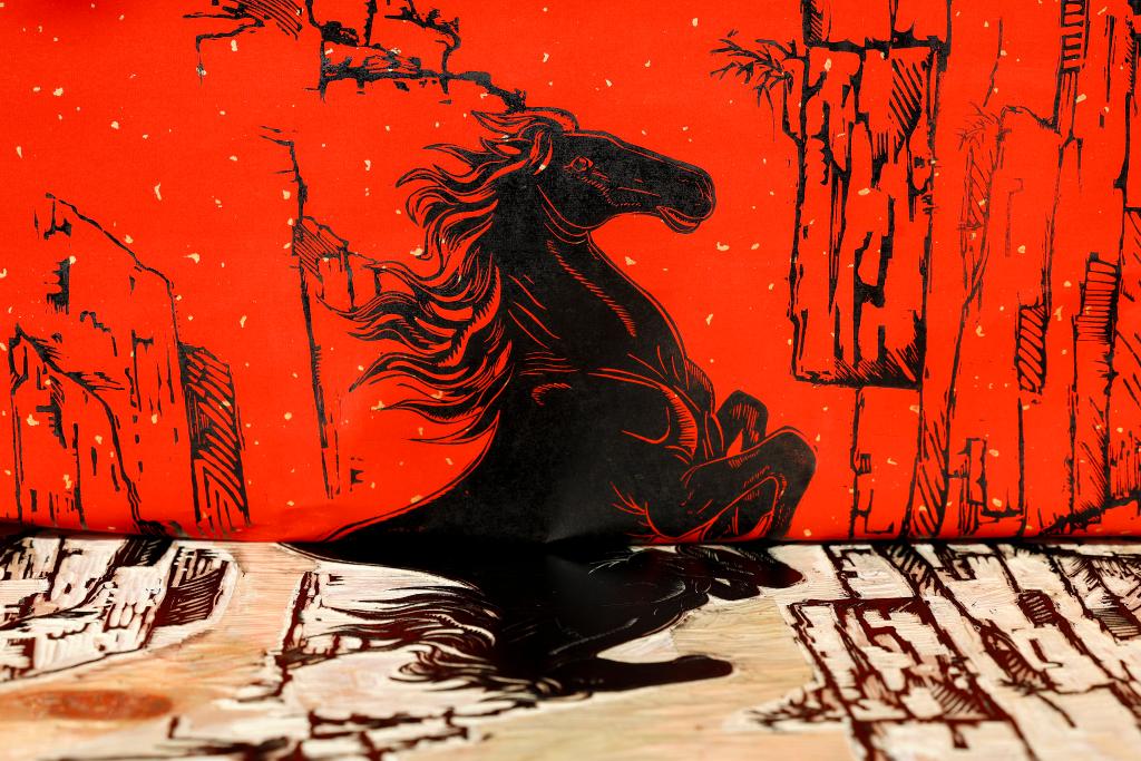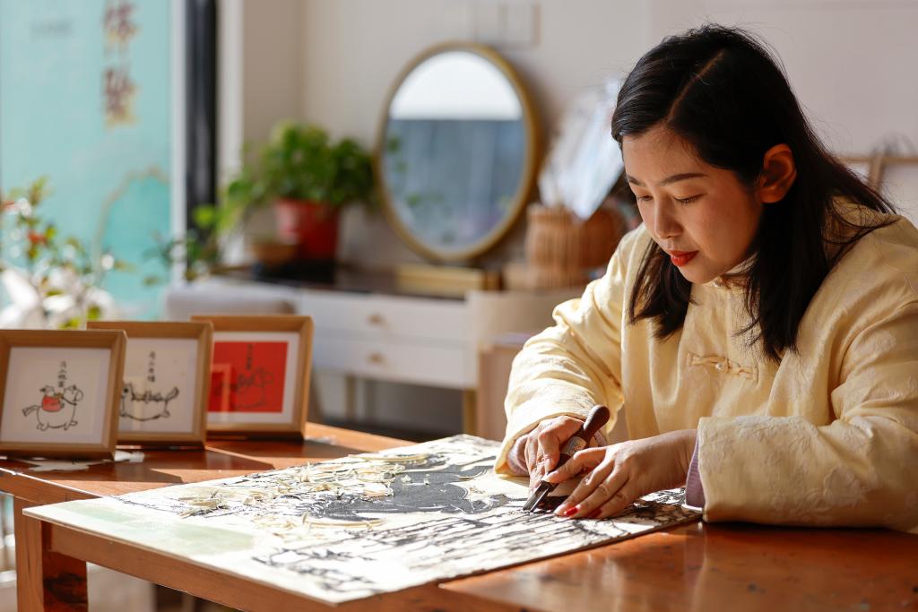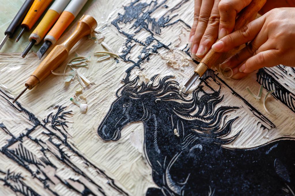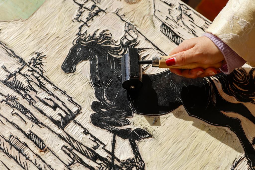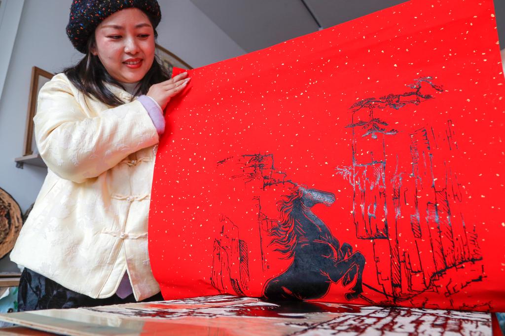 Xue Yin, an inheritor of Huizhou woodblock printing, makes a print themed on the Year of the Horse at a studio in Tunxi District of Huangshan City, east China's Anhui Province, Jan. 6, 2026. (Xinhua/Zhou Mu)