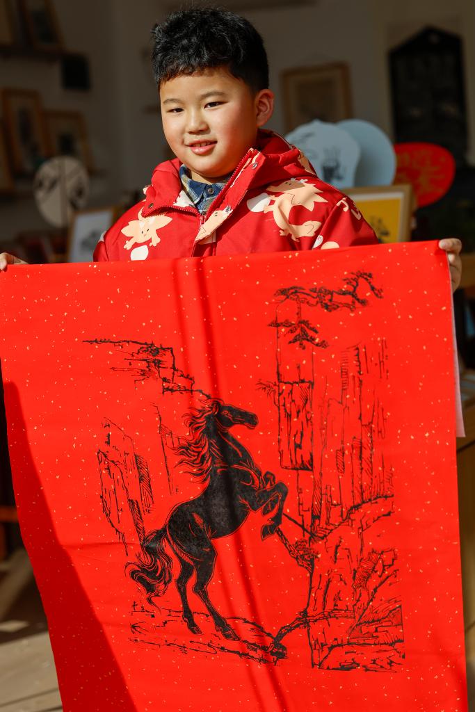 A boy shows a woodblock print themed on the Year of the Horse at a studio in Tunxi District of Huangshan City, east China's Anhui Province, Feb. 11, 2026. (Photo by Shi Yalei/Xinhua)
