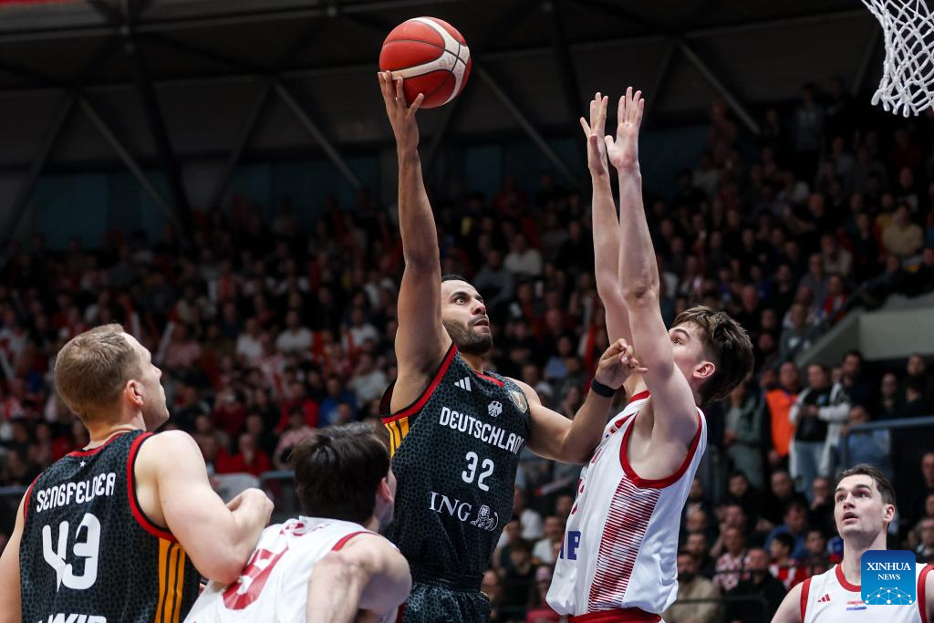 Johannes Thiemann (C) of Germany drives to the basket against Michael Ruzic (2nd R) of Croatia during the first round group E match between Croatia and Germany at the FIBA Basketball World Cup 2027 European Qualifiers in Zagreb, Croatia, on Feb. 27, 2026. (Igor Kralj/PIXSELL via Xinhua)