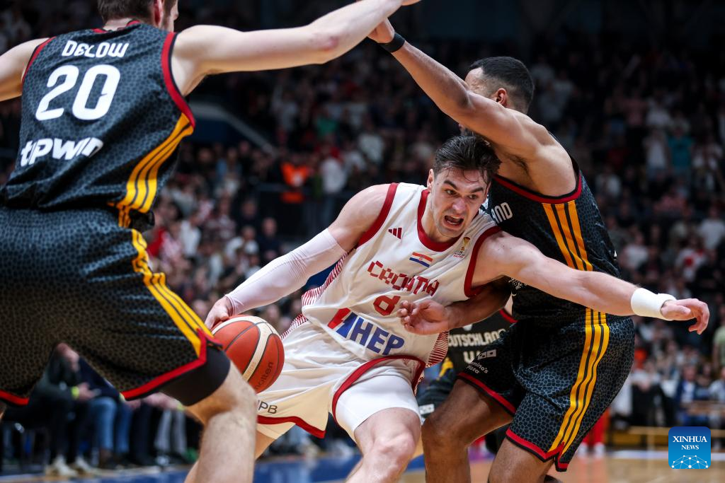 Mario Hezonja (C) of Croatia breaks through during the first round group E match between Croatia and Germany at the FIBA Basketball World Cup 2027 European Qualifiers in Zagreb, Croatia, on Feb. 27, 2026. (Igor Kralj/PIXSELL via Xinhua)